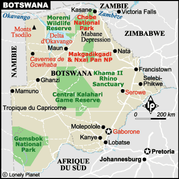 Statut : République du Botswana Superficie : 600 370 km² Population : 2,63 millions d'habitants (2022) Capitale : Gaborone Langue : anglais (officielle), setswana, sekalanga. Monnaie : pula Décalage horaire : UTC+2