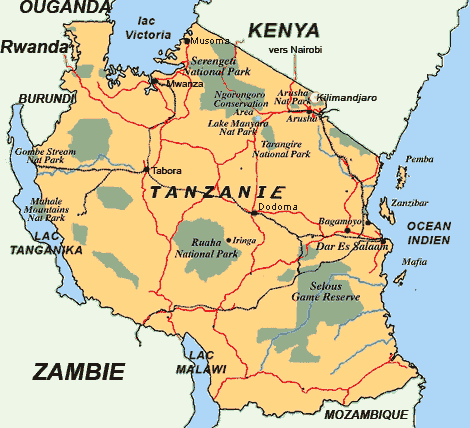 Statut : République unie de Tanzanie Superficie : 947 300 km² Population : 65,5 millions d'habitants (2022) Capitale : Dodoma Langue : swahili et anglais Monnaie : shilling tanzanien Décalage horaire : UTC+3